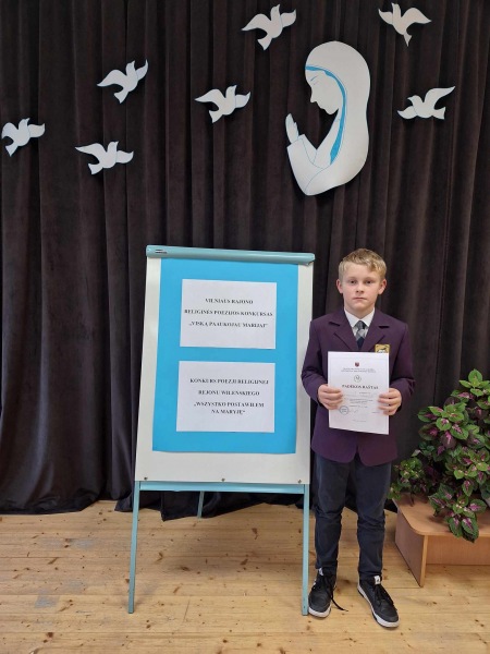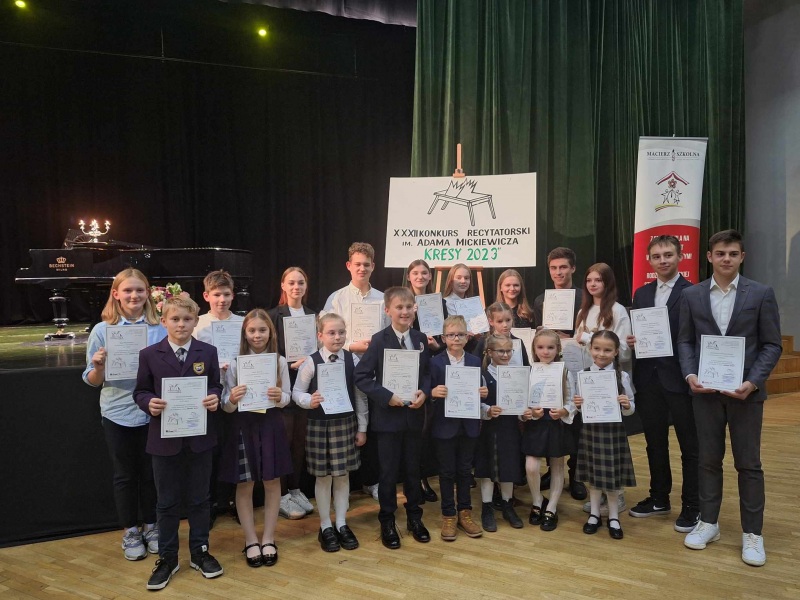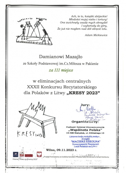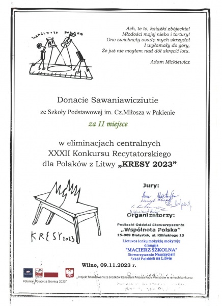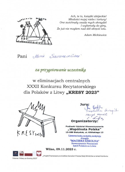 Tydzień był bardzo intensywny, gdyż pomimo działań zaplanowanych w placówce oświatowej, było również sporo zajęć na skalę rejonu. Rozpoczęło się wszystko w naszych rodzimych barwach, ponieważ starsi uczniowie tworzyli kartkę urodzinową dla Niepodległej z okazji 105-tych urodzin. Uczniowie zaś klas początkowych ilustrowali ulubione baśnie, a kolejnego dnia odwiedzili Muzeum Wł. Syrokomli w Borejkowszczyźnie, gdzie brali udział w „Tygodniu Pięknej Litery”. Nieco nietypowym zajęciem było tworzenie rogatywek żołnierskich oraz fotosesja z danym atrybutem. Oprócz tego w rejonie wileńskim odbyła się Miniolimpiada Języka Polskiego dla uczniów klas 8. Naszym uczennicom była ona bardzo pomyślna, gdyż Marta zdobyła III miejsce, zaś Magdalena — wyróżnienie. 9 listopada sześcioosobowa grupa uczniów brała udział w krajowych zmaganiach konkursu recytatorskiego im. A. Mickiewicza „Kresy 2023”. To również był sukces, gdyż czworo uczniów zostało laureatami eliminacji centralnych.