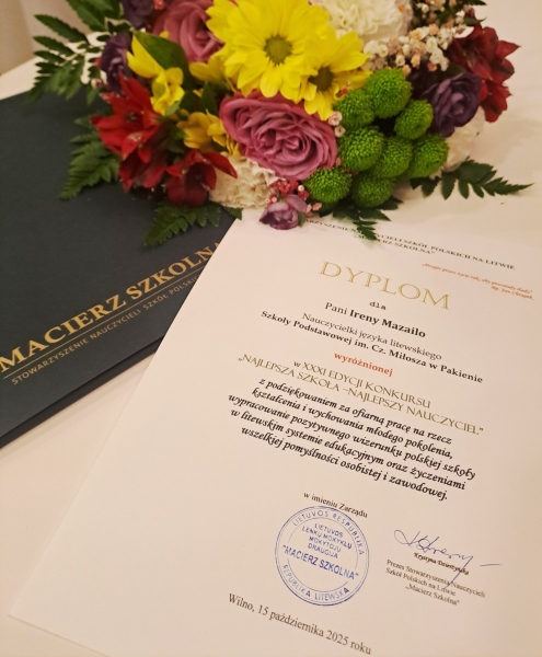 Spalio 15 d. Lenkų kultūros namuose Vilniuje jau 31 kartą Lietuvos lenkų mokyklų mokytojų draugija „Macierz Szkolna“ išrinko ir apdovanojo geriausias Lietuvos lenkiškas mokyklas ir geriausius jose dirbančius mokytojus. Šiemet apdovanojimą gavo mūsų lietuvių kalbos vyresn. mokytoja Irena Mazailo.