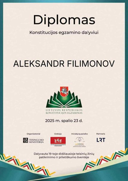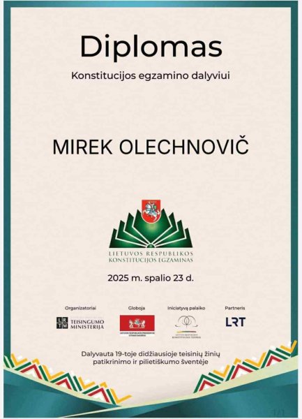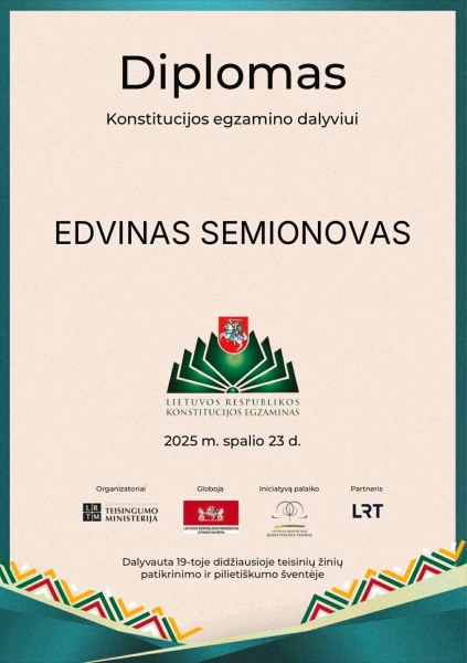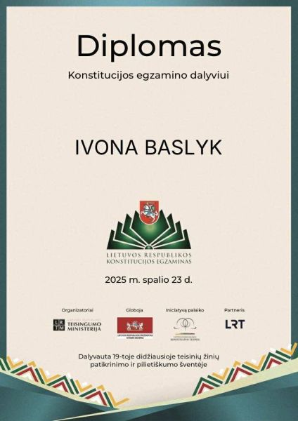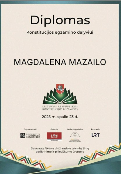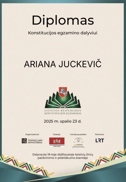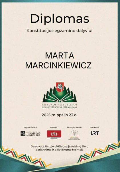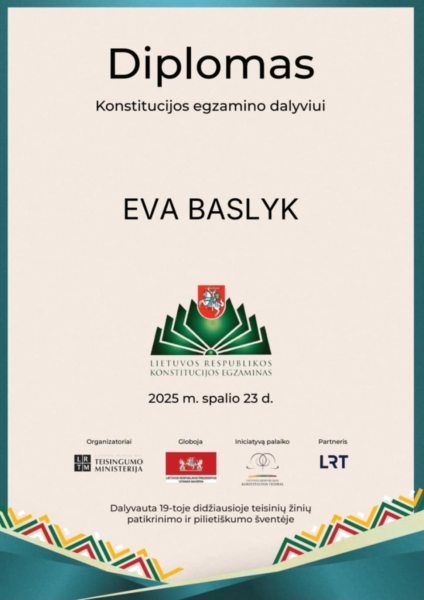 Spalio 23 d. 9–10 kl. mokiniai (mok. Renata Deinarovičienė) tikrino savo Konstitucijos žinias dalyvaudami visuotinėje teisinių žinių iniciatyvoje — Konstitucijos egzamine.