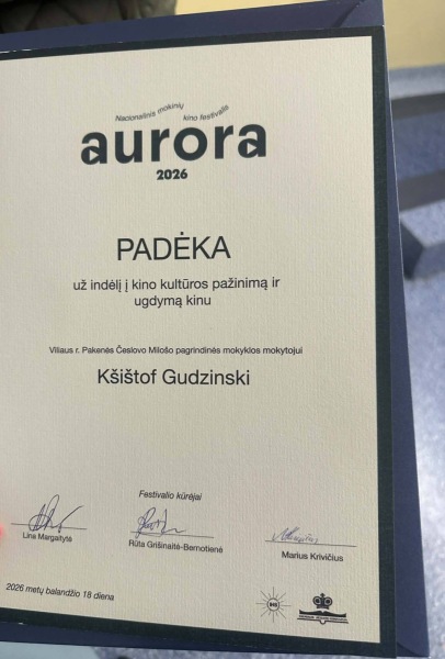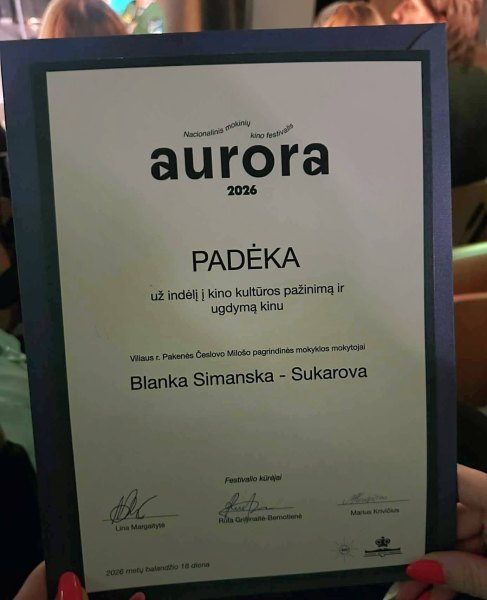 Balandžio 17–18 d. dešimtokės, Marta Marcinkevic ir Magdalena Mazailo (mok. Blanka Šimanska- Sunkarova, Kšištof Gudzinski), dalyvavo Nacionaliniame mokinių kino festivalyje Aurora 2026.
