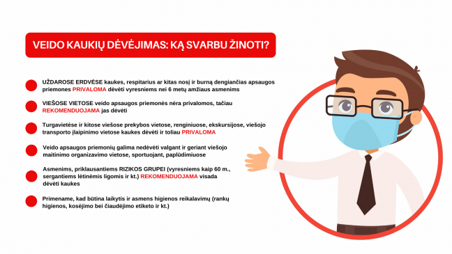 Nuo rytojaus kaukių dėvėjimas atvirose viešose vietose nebus privalomas, o rekomenduotinas. Svarbu pabrėžti, kad tokiose atvirose vietose, kaip turgavietėse, viešose prekybos vietose, renginiuose, ekskursijose ir viešojo transporto įlaipinimo vietose dėl žmonių susibūrimų – kaukes ir toliau privaloma dėvėti.
