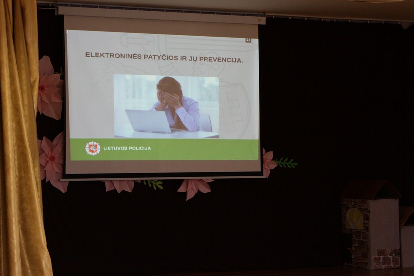 Kovo 24 d. 5–9 kl. mokiniams vyko paskaita „Elektroninės patyčios ir jų prevencija“, kurią skaitė Vilniaus apskrities vyriausiojo policijos komisariato Vilniaus rajono policijos komisariato 1‑ojo veiklos skyriaus vyresnioji tyrėja Irena Jankovska.