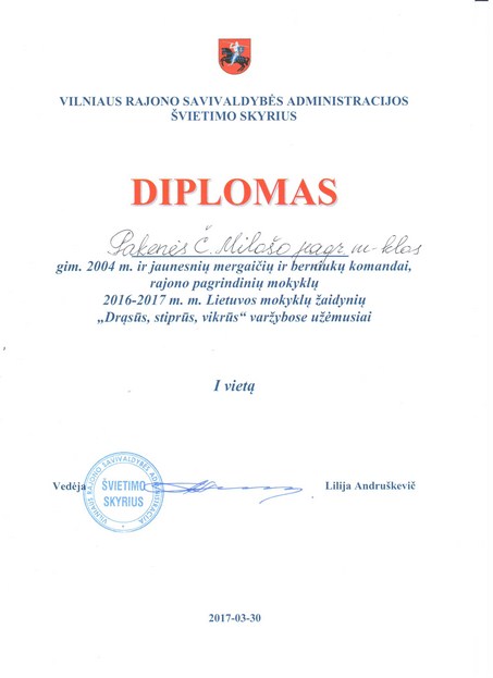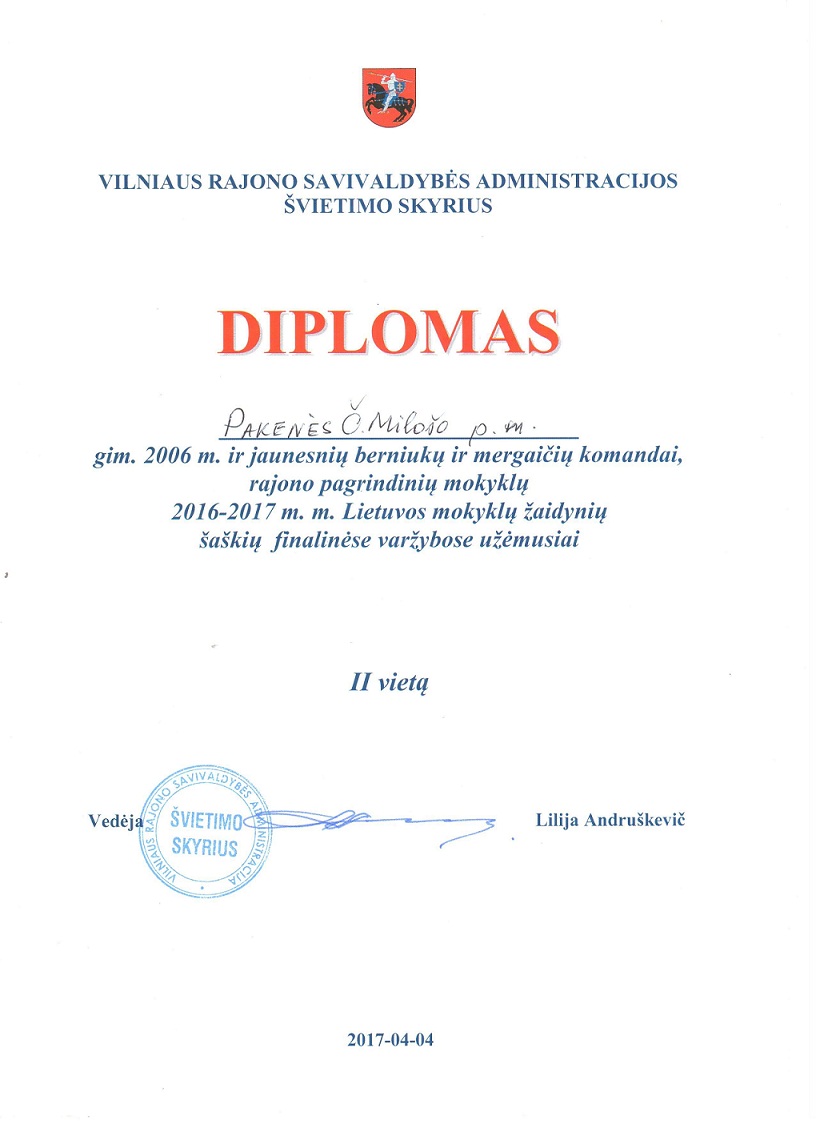 Balandžio 4 d. trys 4 kl. mokiniai (Viktorija Andrijevskaja, Dmitrij Filimonov, Mateuš Volkovicki) dalyvavo pagrindinių mokyklų mergaičių ir berniukų šaškių finalinėse varžybose, kurios vyko Riešės šv. Faustinos Kovalskos pagrindinėje mokykloje. Mokiniai užėmė II vietą!