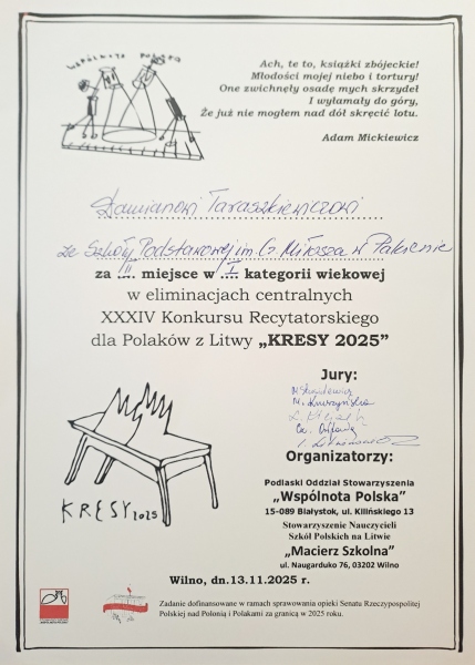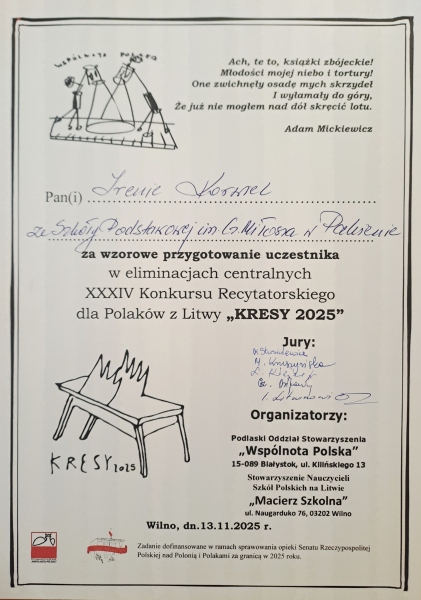 13 listopada, w ramach Tygodnia Języka Polskiego, uczniowie klas 9 i 10 (naucz. B. Szymańska-Sunkarowa) wzięli udział w bitwie intelektów. Pytania, nad którymi głowili się uczniowie, dotyczyły Święta Niepodległości Polski, literatury polskiej i gramatyki języka polskiego oraz życia szkolnego i miejscowości Pakiena.
