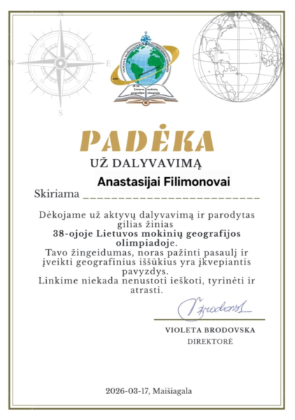 Kovo 17 d. 9 kl. mokinė Anastasija Filimonova (mok. Kšištof Gudzinski) dalyvavo 38-osios Lietuvos mokinių geografijos olimpiados II etape, kuris vyko Vilniaus r. Maišiagalos kun. Juzefo Obrembskio gimnazijoje.
