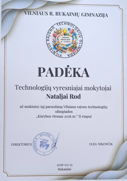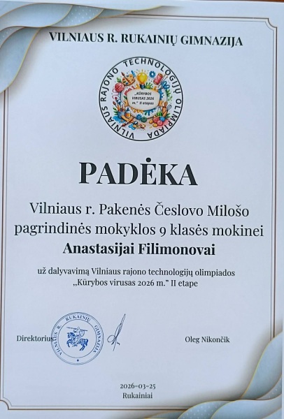 25 marca uczennica kl. 9 Anastazja Filimonowa (naucz. Natalja Rodź) brała udział w rejonowej olimpiadzie z technologii „Wirus twórczości 2026“, która odbyła się w Gimnazjum w Rukojniach.