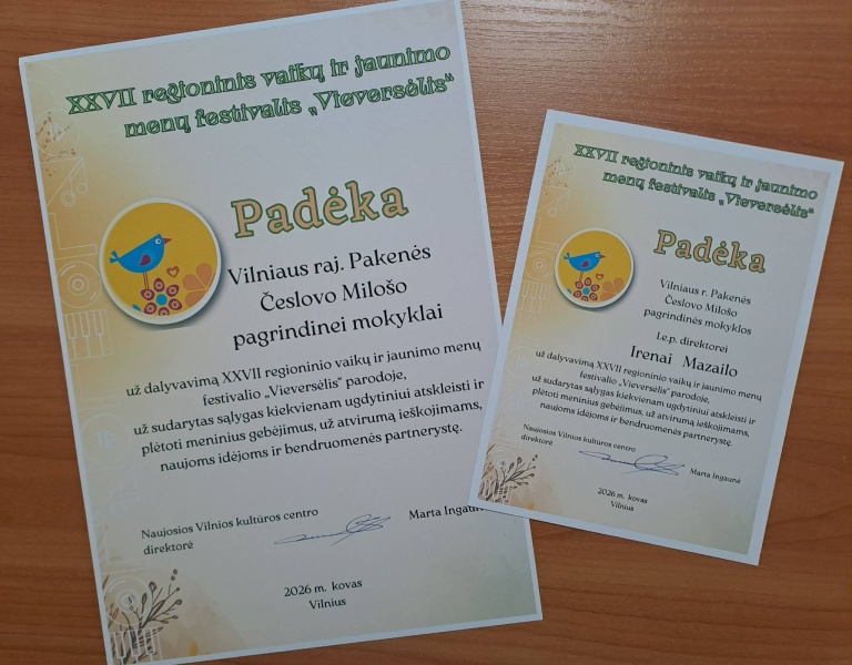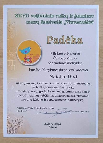 Balan­dį mūsų moki­nių dar­bai (mok. Natal­ja Rod) pag­ra­ži­no XXVII regio­ni­nį vai­kų ir jau­ni­mo menų fes­ti­va­lį „Vie­ver­sė­lis“, kuris vyko Nau­jo­sios Vil­nios kul­tū­ros centre.